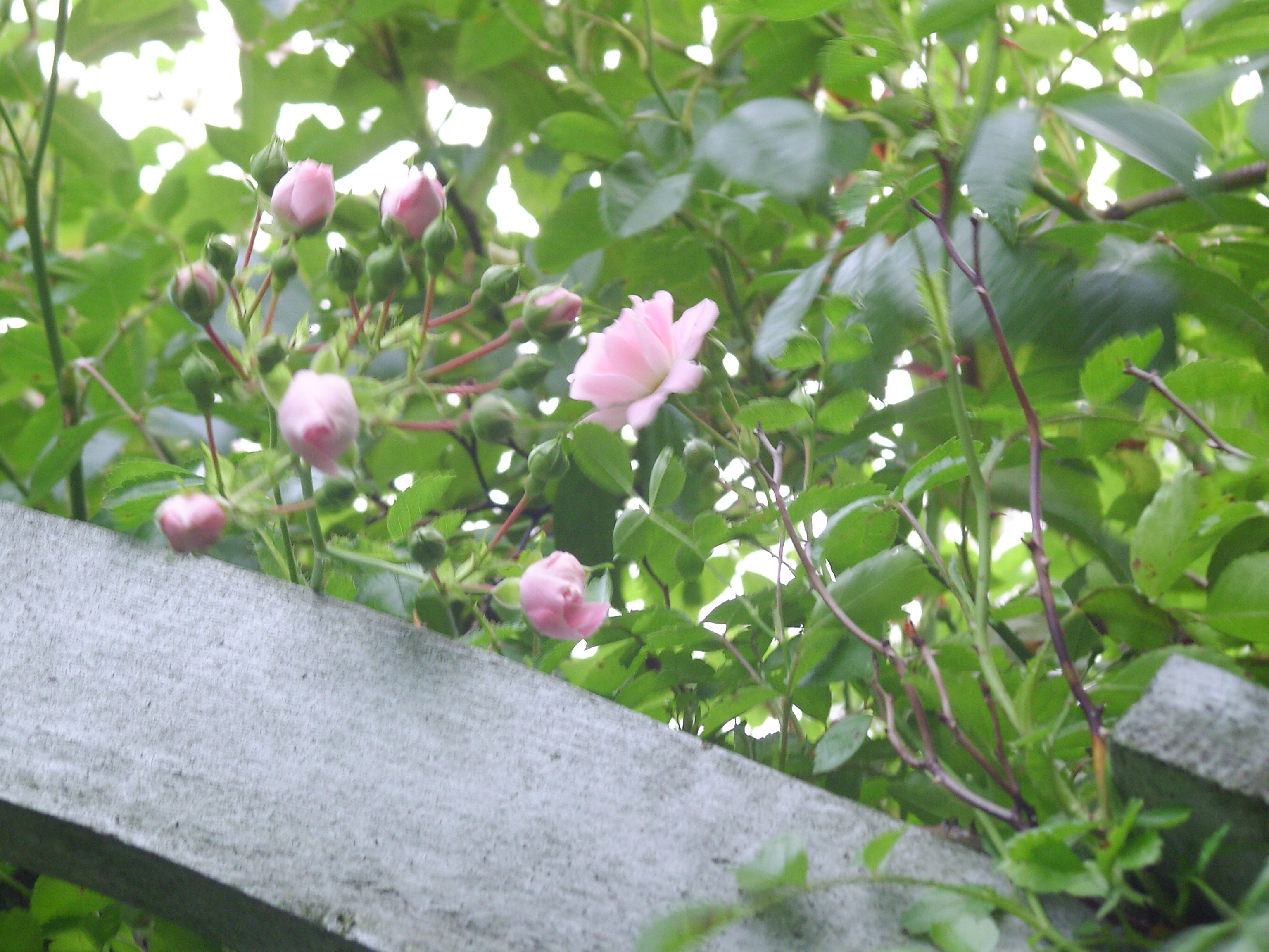 Några sådana buskar skulle offras och jag ritade en överliggare som exempel på bågarna över gången som min man sedan snickrade. Träet målades grått och sen var det dags att inhandla rosor.