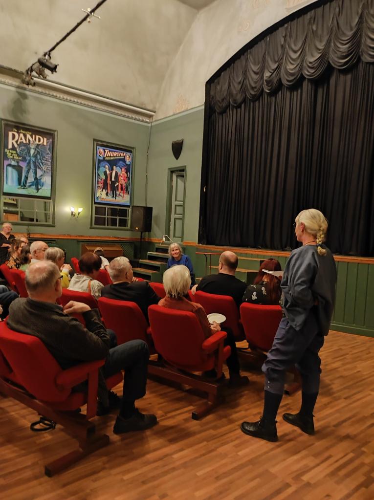 Till boksläppet hade jag hyrt Magiska teatern i Vretstorp, lokalen som är en gammal biograf var perfekt. Jag tror att jag egentligen redan här var sjuk. Det var hur som helst så fint att se att så många kom och det blev skratt och allvar om vartannat. Här ovan håller min vän Bitte W ett fint tal till mig. Hon var den jag med förtroende hade skickat de nya kapitlen till.